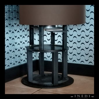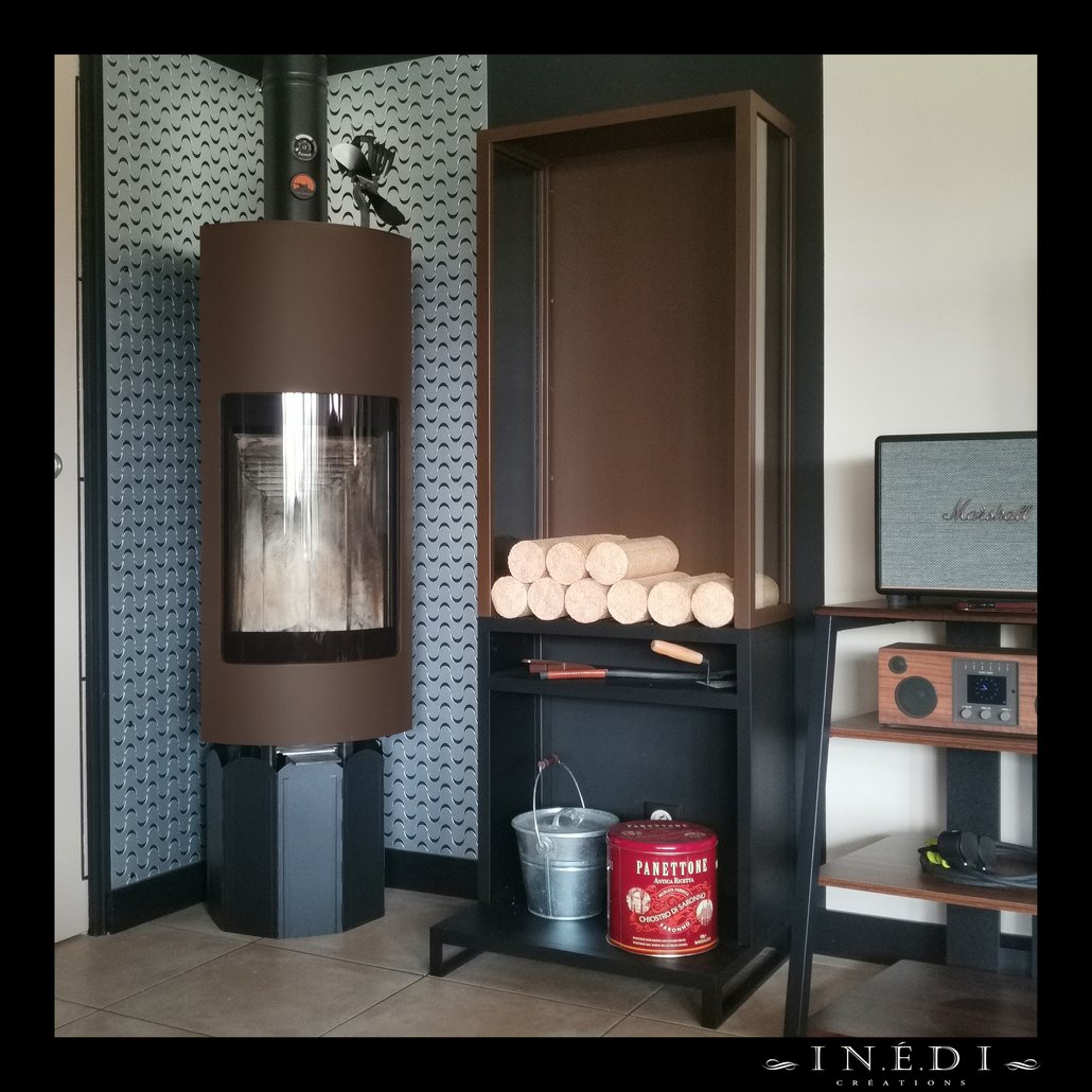 Fabrication sur mesure d'un porte buches vitré sur la partie haute et dans les mêmes tons que le poêle