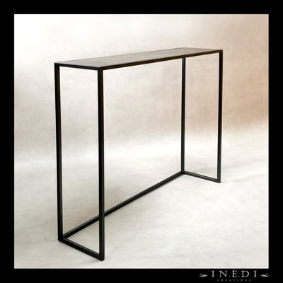 Cadres en chêne, fond et dessous en simili cuir noir, poignées en acier réalisées sur mesure.