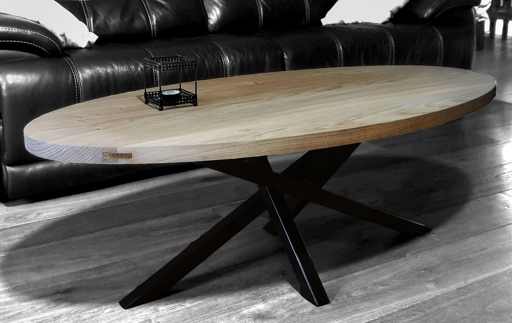 Pour ce plateau en chêne massif, sa forme elliptique se marie très bien avec celle du piétement en acier de style Mikado .