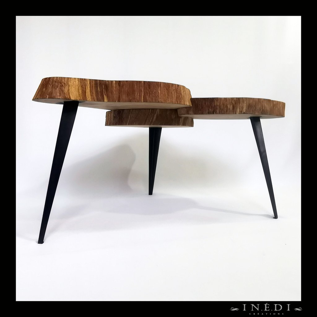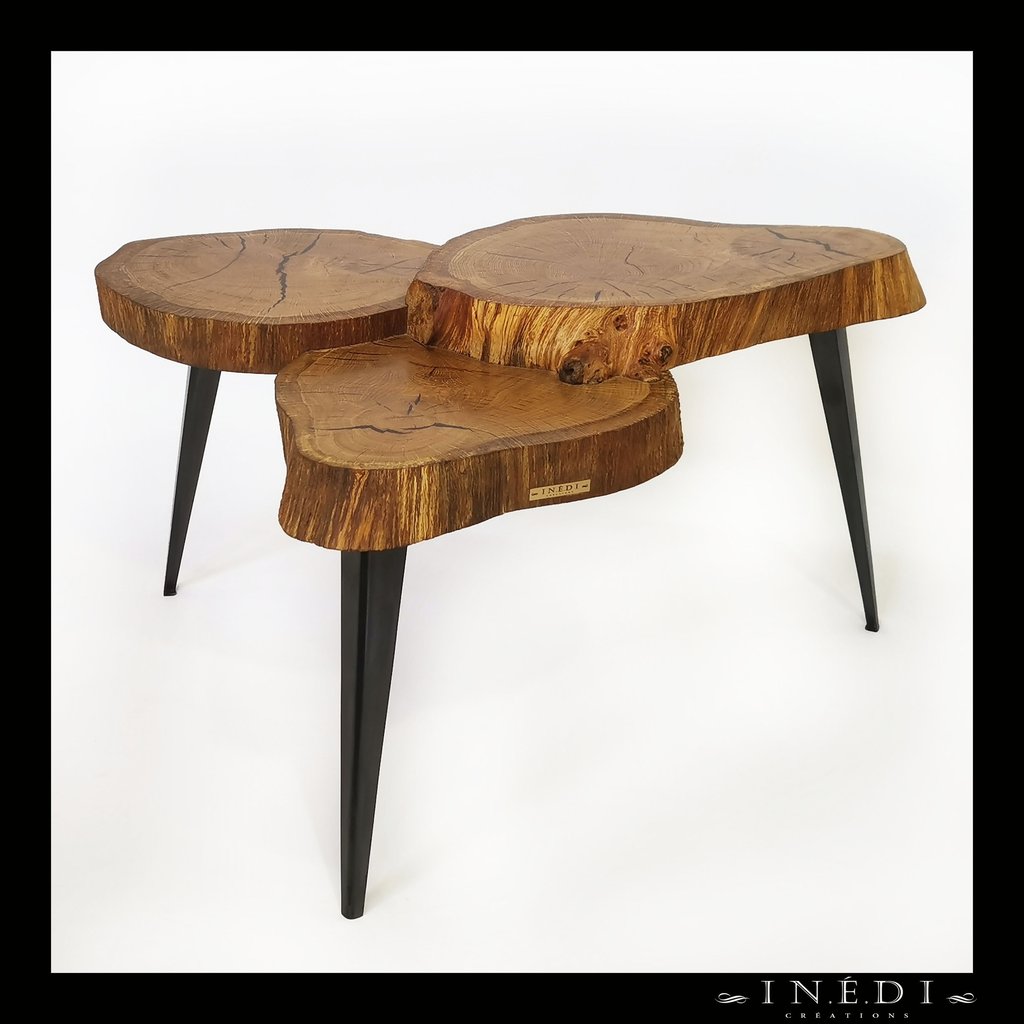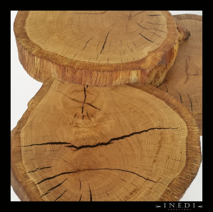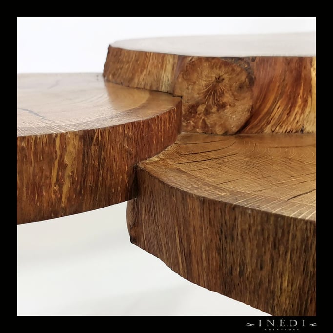 Un peu d'originalité avec cet assemblage sur trois niveaux de rondelles de chêne massif dont les fentes ont été comblées avec de la résine époxy noire. Les arrêtes ont été gardées vives pour un contraste entre la surface qui est parfaitement lisse et la tranche qui est à l'état brut.
