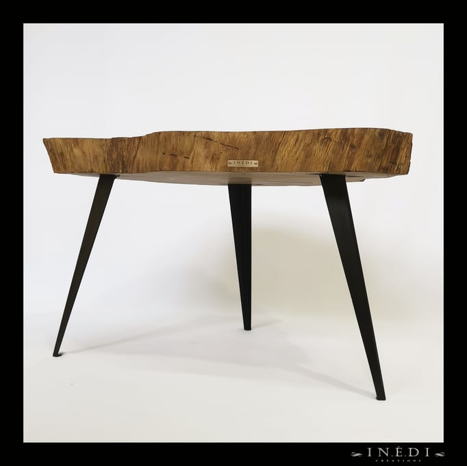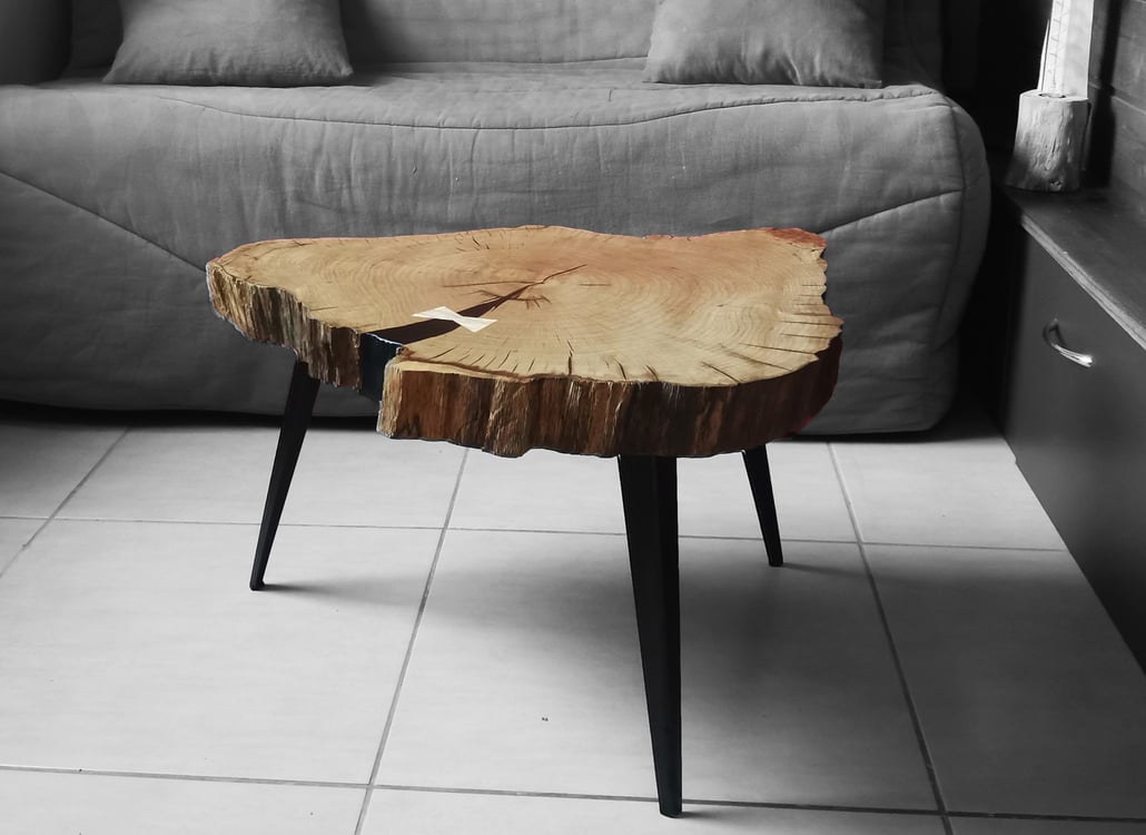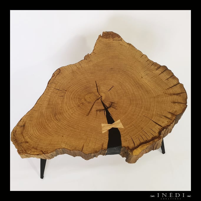 Cette petite table est réalisée à partir d'une tranche de chêne,