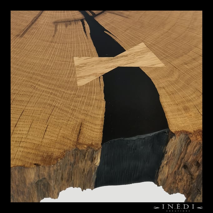 La fente est bloquée avec un tenon ou papillon, puis comblée avec de la résine époxy.