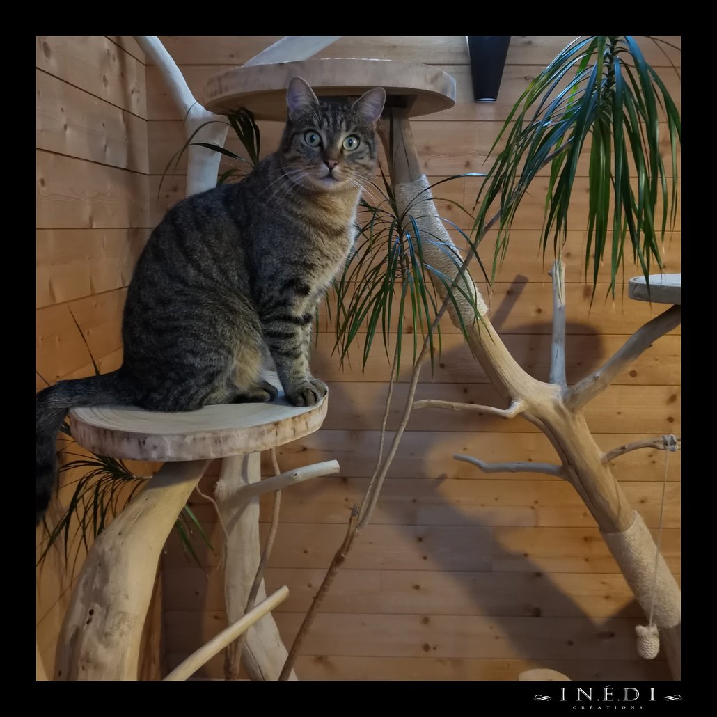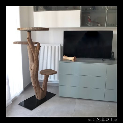 Cet arbre à chat , Aggakhar en l’occurrence , a trouvé sa place dans un petit appartement. Les plateaux d'origine ont été remplacés par des plateaux un peu plus grand pour accueillir un félin au gabarit imposant.